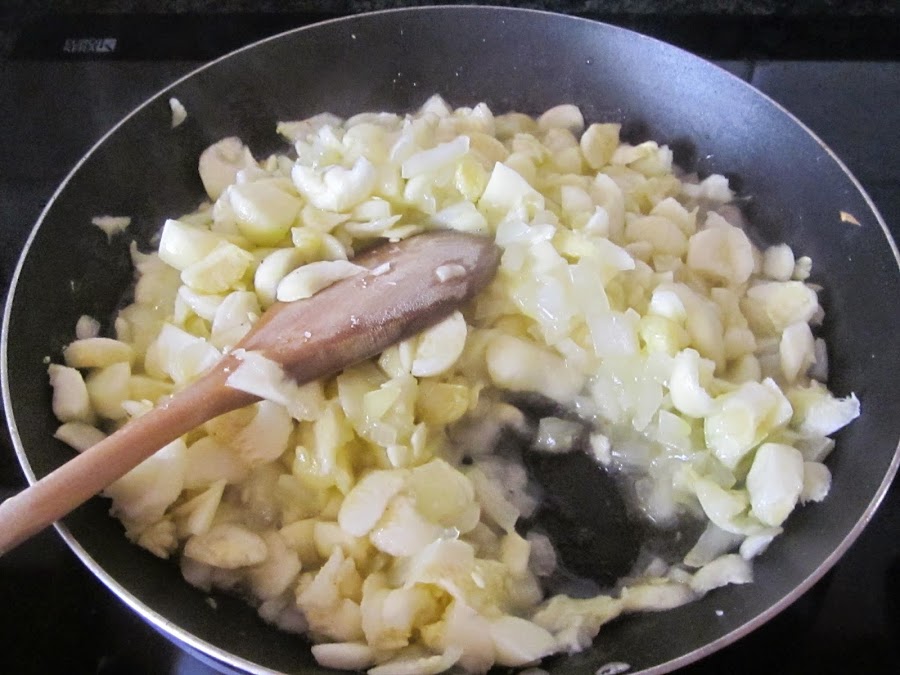 Ponemos un fondo de aceite en una cacerola y empezamos a sofreír la cebolla picada, cuando haya pochado añadimos las bolas del calabacin que habremos troceado,