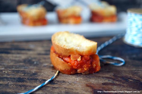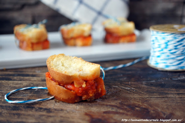 4) Untar la mitad de los trozos con la sobrasada al gusto, la otra mitad la retiramos del horno que serán las tapas. Volver a llevar al horno a 200º con la función grill , es decir, calor solo arriba y gratinar 2 minutos. Retirar del horno.