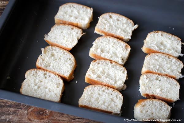 1) Cortar los panecillos en rebanadas de 1/2 cm más o menos, a mi me han salido 12 rodajas de cada uno, o sea 6 minis por bollo. Descartar los extremos o guardar para otra cosa.