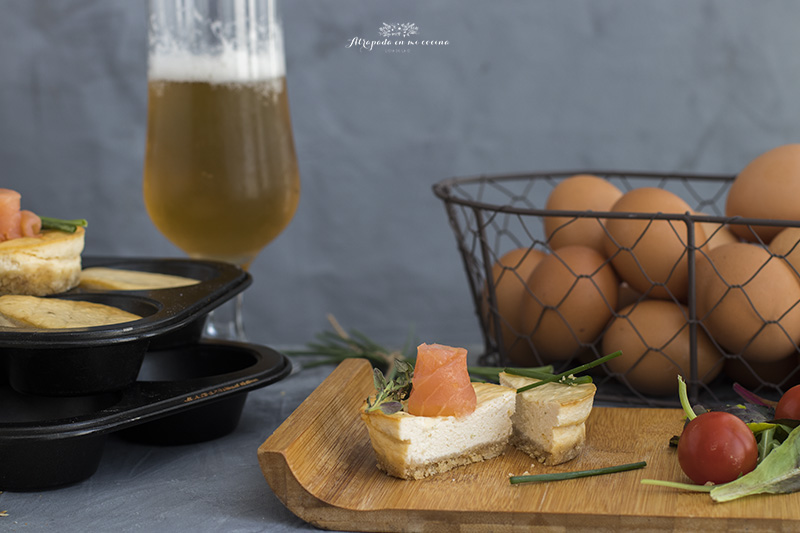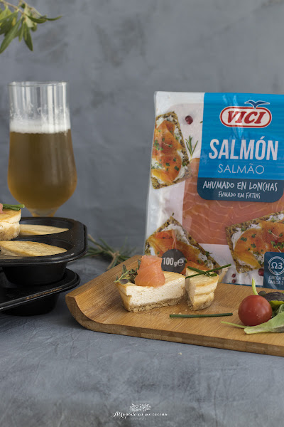 El día 20 de junio celebramos el #diamundialdelatapa, y como no podía ser de otra forna hay que rendirle un buen homenaje a esos pequeños bocados que nos hacen tan felices acompañados de una cerveza o un vino. En esta ocasión la propuesta viene realizada con el salmón ahumado de VIČI, y he querido preparar unas mini cheesecake de salmón ahumado, unas mini deliciosas tartitas de queso y salmón ahumado que se comen de dos bocados y que están realmente deliciosas, con su base de galletitas saladas, su interior con intenso sabor a salmón y su topping del mismo salmón ahumado y un poco de cebollino fresco, junto a una ramita de romero.