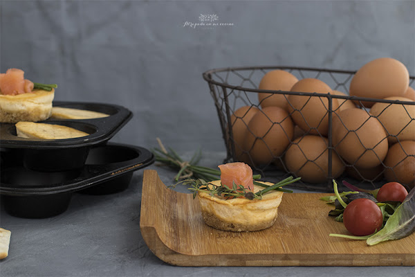 Mientras tanto preparamos el relleno, para ello trituramos el salmón junto con el queso, la nata (crema de leche), unos tallos de cebollino fresco y los huevos. Salpimentamos. Vertemos la mezcla en los moldes y llevamos al horno precalentado a 150º durante unos 45 minutos aproximadamente, hasta que estén doradas. Dejamos que se enfríen durante unos 15 minutos dentro del horno y luego sacamos. Desmoldamos con cuidado.