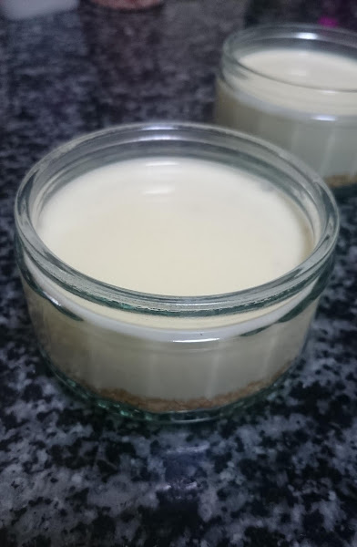 Sacamos nuestros vasitos de la nevera y vertemos la mezcla de queso. Huele súper bien. Los llevamos de nuevo al refrigerador y los tenemos una media de 4-5 horas. Decoramos con tiras de naranja y...servimos!