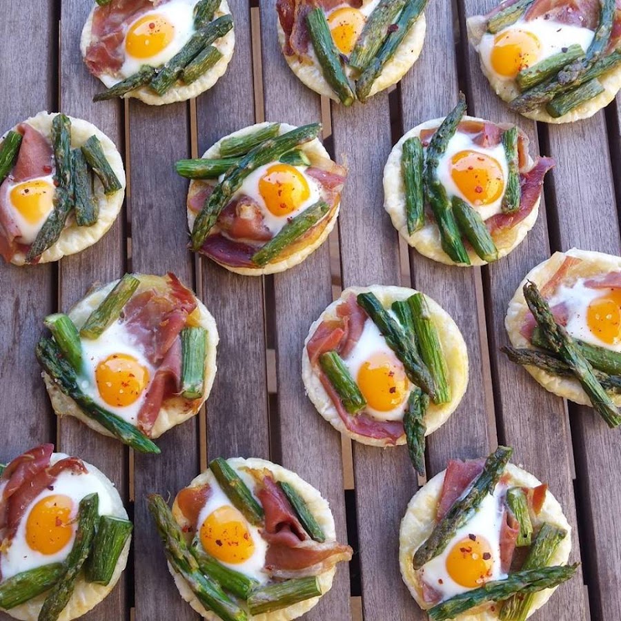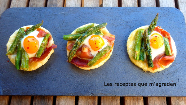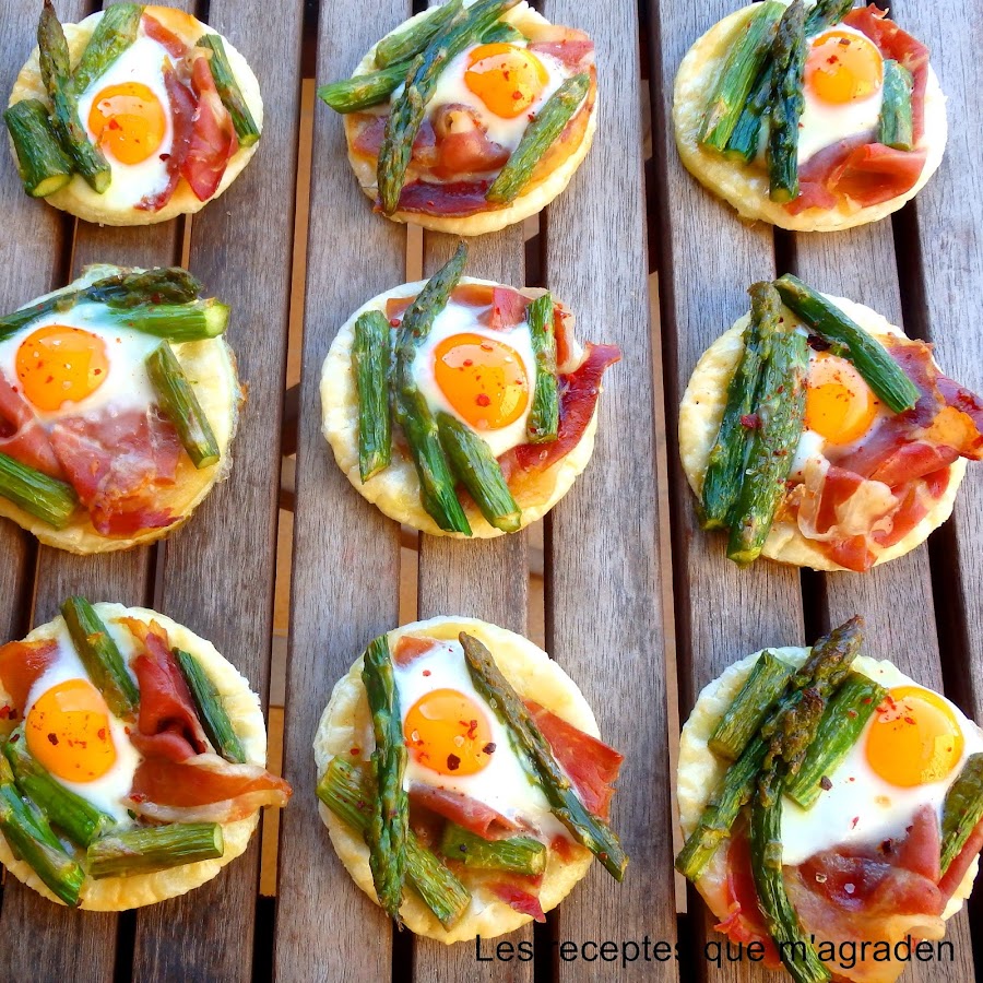 Mini cocas de jamón, espárragos y huevos de codorniz