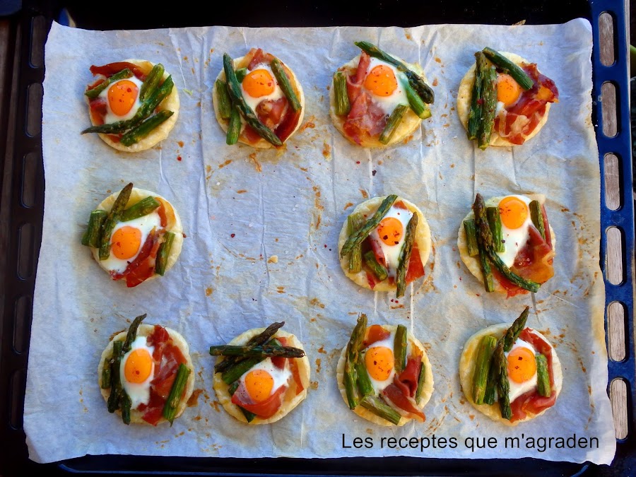 Repartimos encima de las mini cocas medio cocidas un poco de jamón serrano tratando de que quede bien puesto, por encima vaciamos un huevo de codorniz crudo y colocamos dos o tres trozos de espárrago. No ponemos sal ya que la yema de los huevos no nos quedaría bonita.