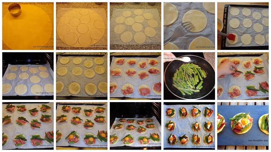 Mini cocas de jamón, espárragos y huevos de codorniz, preparación: