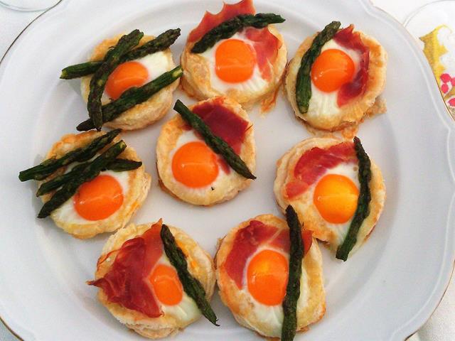 Repartimos encima de las mini cocas medico cocidas un poco de jamón serrano tratando de que quede bien puesto, por encima vaciamos un huevo de codorniz crudo y colocamos dos o tres trozos de espárrago. No ponemos sal ya que la yema de los huevos no nos quedaría bonita.