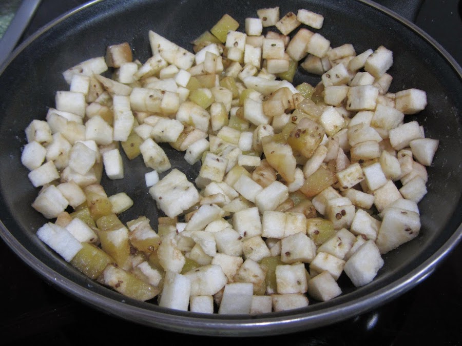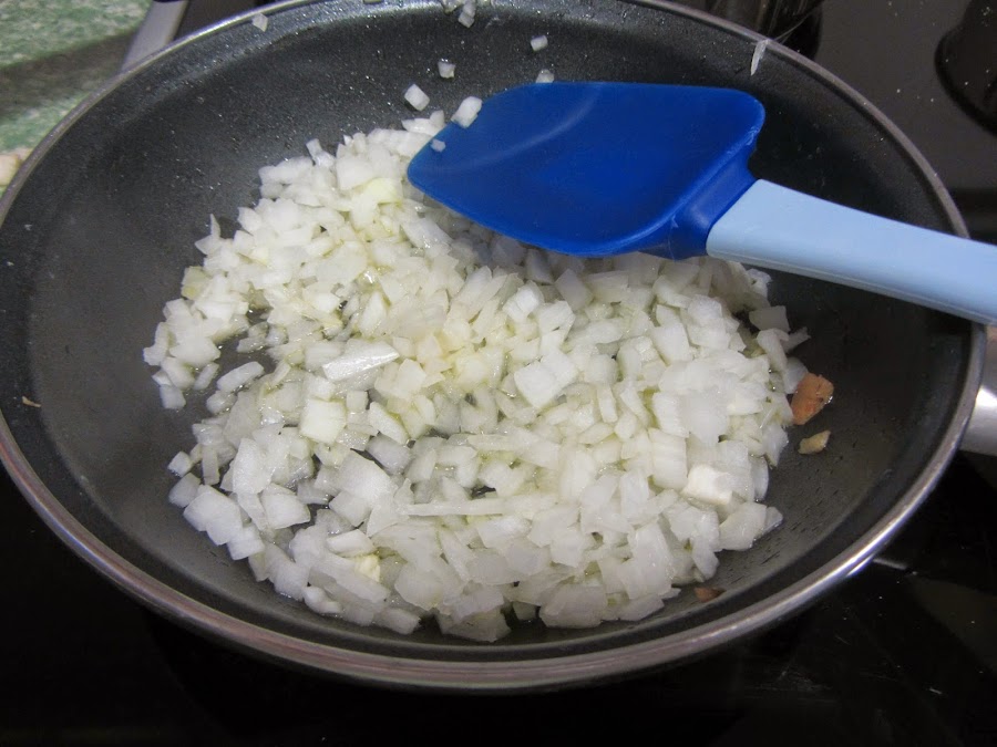 Cuando esté un poco dorada, la retiramos, y reservamos. Y en ese mismo aceite (puede hacer falta añadir algo más), rehogamos la cebolla a fuego algo más suave.