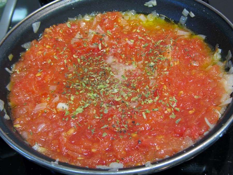 Cuando esté transparente, añadimos el tomate rallado, y orégano y albahaca, pimienta, sal y una pizca de azúcar o edulcorante (para contrarrestar la acidez del tomate), dejamos que se vaya cocinando todo junto, y que se reduzca un poco el líquido (unos 15 minutos).