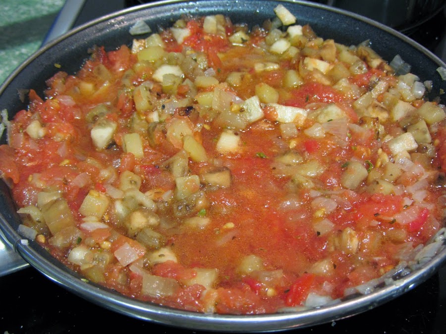 Después agregamos la berenjena, y rehogamos unos 5 minutos más.
