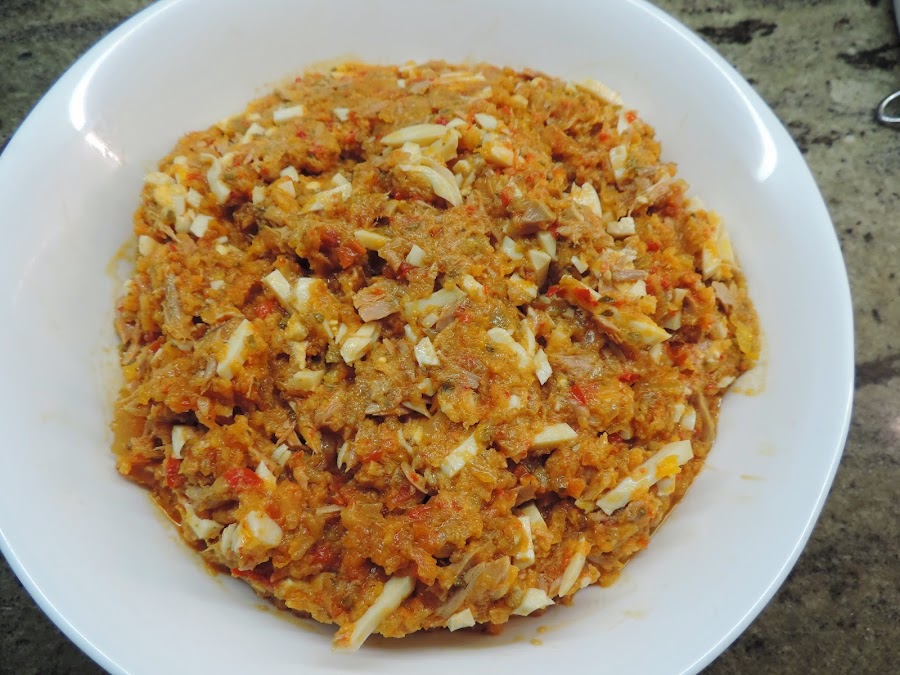 Les ponemos en el centro un bol con un poco de mezcla de pisto, atún y huevo que ha sobrado.