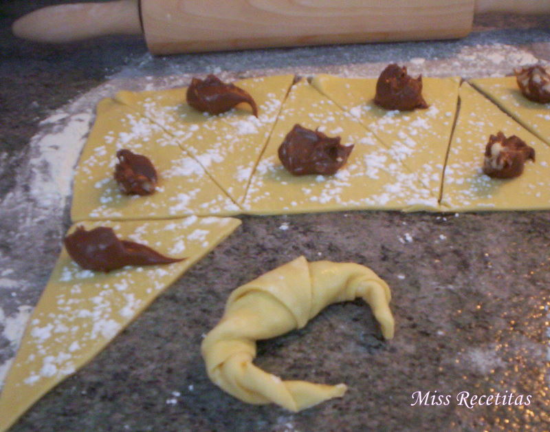 Enrollamos el croissant comenzando por la base, es decir por el lado mas ancho, cuidando de cerrarlo bien para que no se salga chocolate al hornearlo.