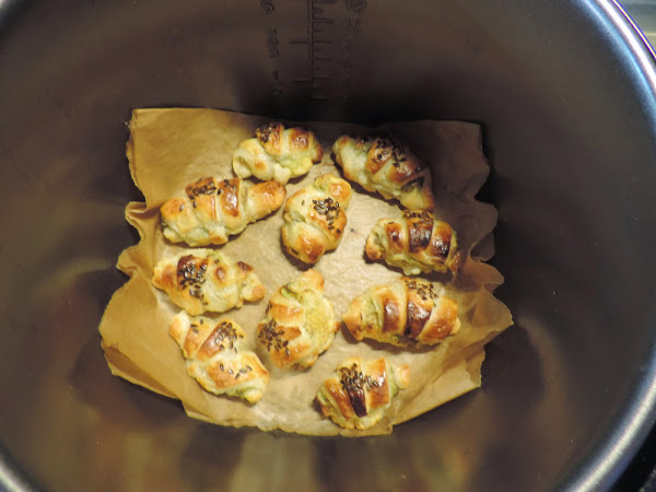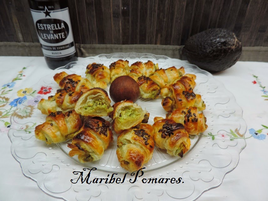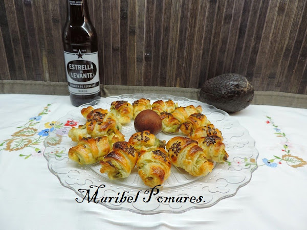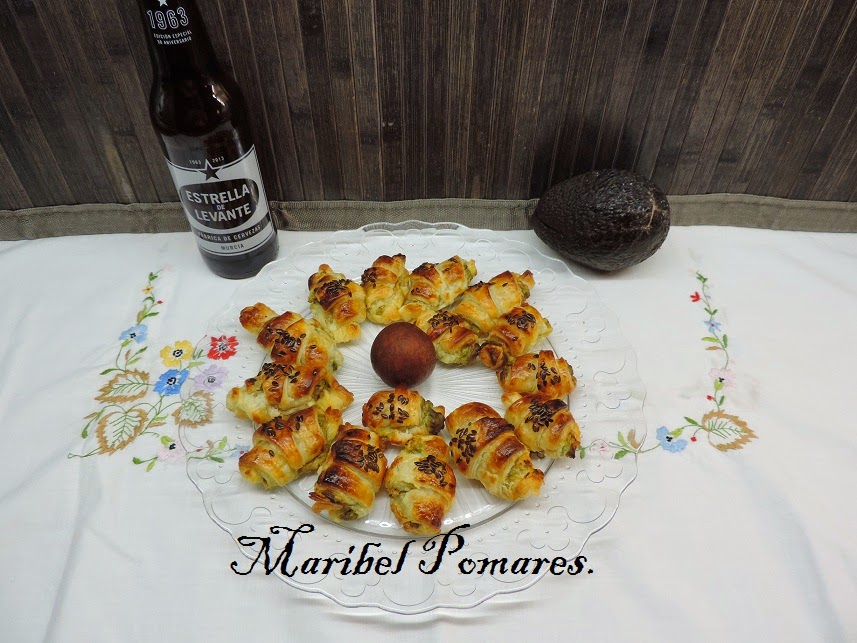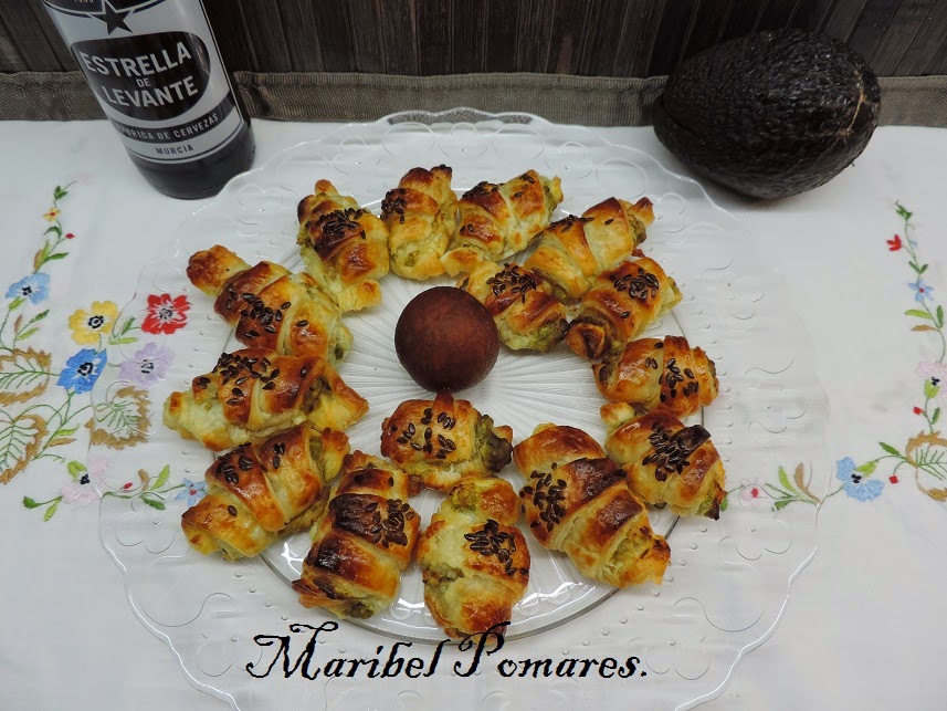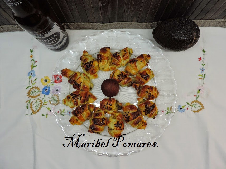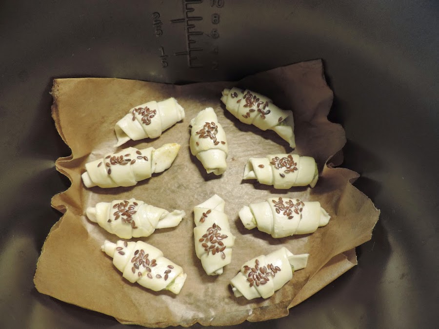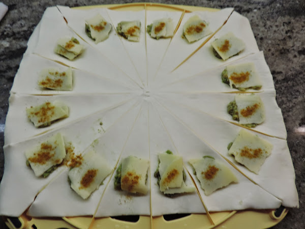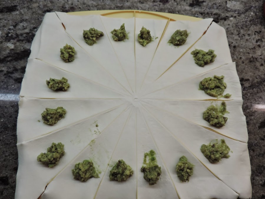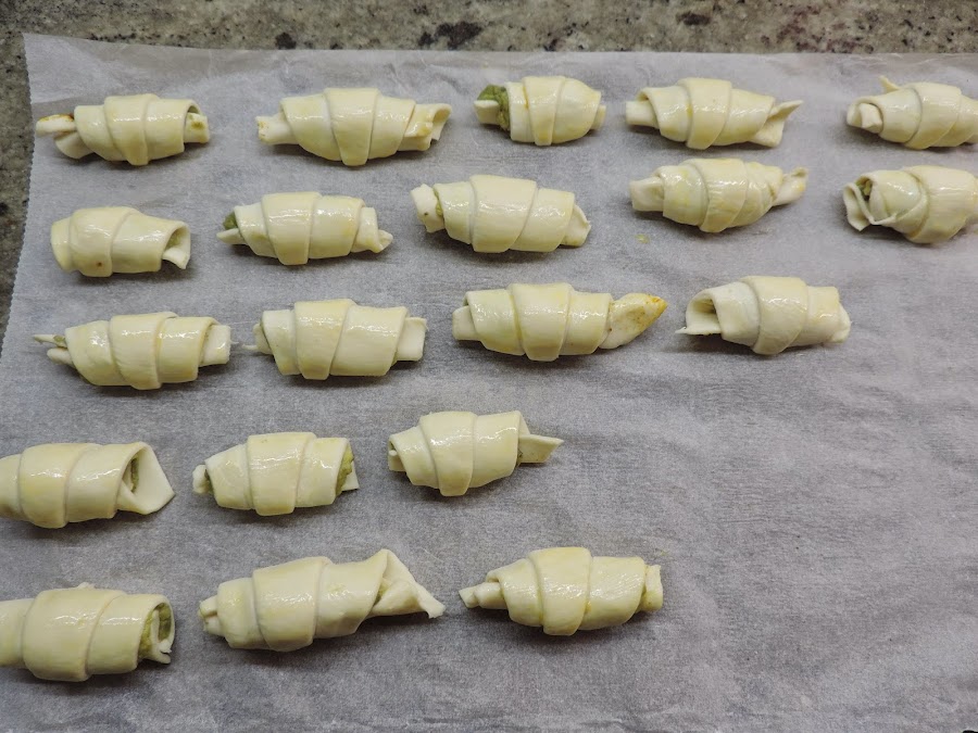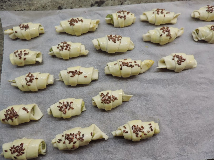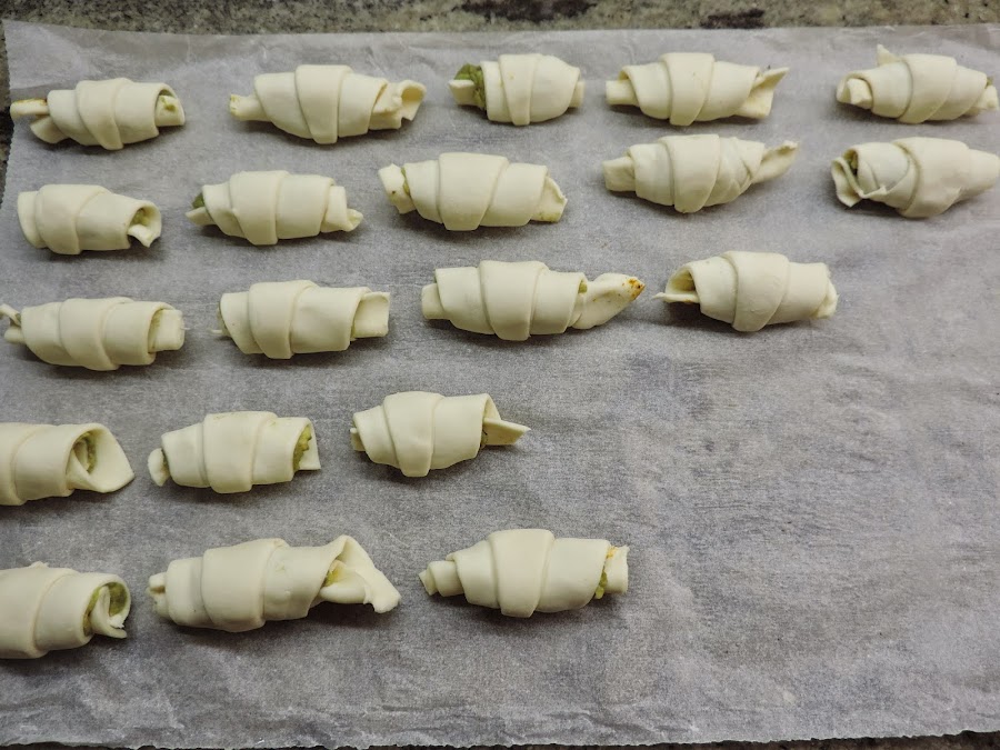Hacemos los mini croissant, enrollando de atrás hacia adelante y los vamos poniendo encima de papel de horno.