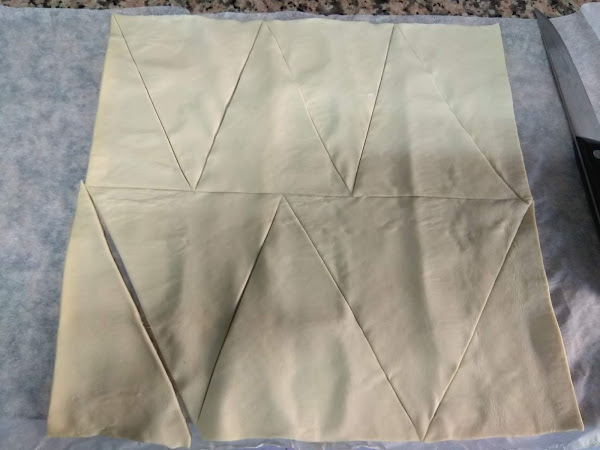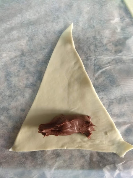 Una vez cortados los triángulos los cogemos y le ponemos una cucharada de postre de crema de cacao en la parte de abajo en medio.Como podéis ver en la foto B.