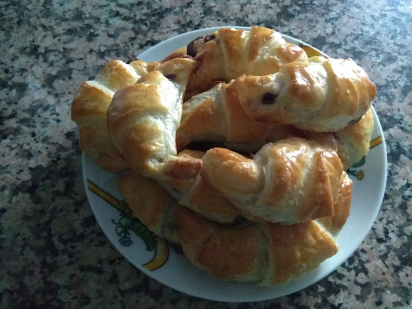 Una vez puesta la crema de cacao,los enrolláis hacia arriba para dejarlos como un rollito .Ahora los vais dejando en la bandeja de horno bien rectos o bien haciéndole los cuernos doblando las puntas para abajo.Esto lo podéis ver en la foto C.