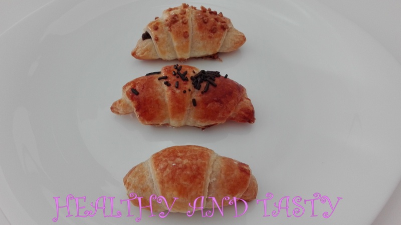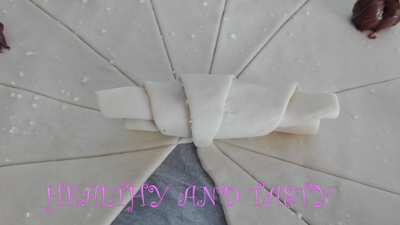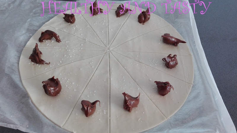 Con un cortapizzas cortamos el hojaldre en triángulos. Espolvoreamos azúcar glass por encima y ponemos en los extremos de cada triángulo una cucharadita pequeña de Nocilla o Nutella. Si no tenemos, podemos poner una onza de chocolate.