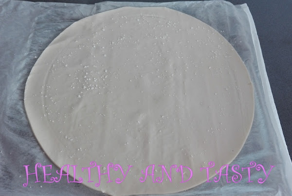 Para hacer estos deliciosos croissants necesitamos una lámina de hojaldre redonda. Si la que tenemos es rectangular, ponemos un plato grande encima para dar forma y cortamos con un cuchillo para dar la forma redonda al hojaldre. Con la masa sobrante hacemos una bola, la aplastamos con el rodillo y cortamos dos triángulos más. Una vez tenemos la base redonda, la ponemos sobre papel vegetal o sobre la encimera con un poco de harina espolvoreada para que no se pegue. Si la ponemos sobre papel vegetal no se pegará.