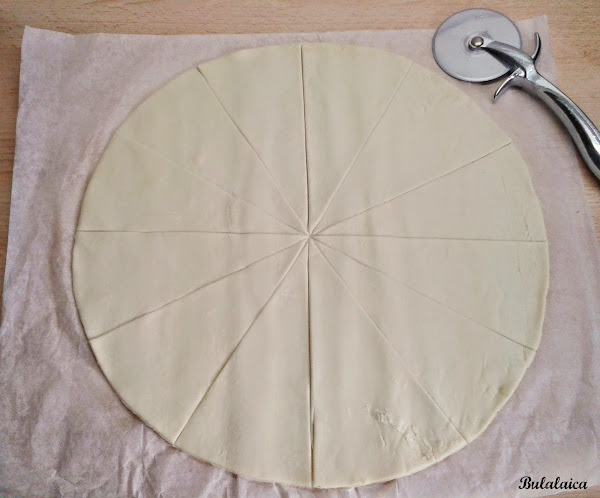 3. Con la ayuda de un corta-pizzas, cortamos la lámina como en la imagen, de forma que nos queden 12 triángulos del mismo tamaño.