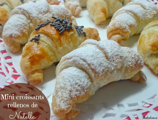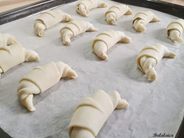 6. Enrollamos cada triángulo desde la parte ancha hacia la parte estrecha, dejando dentro la crema de chocolate (hay que presionar un poco para sellarlos y que no se salga la Nutella). Giramos los extremos y los metemos un poco hacia dentro para dar la forma de croissant.