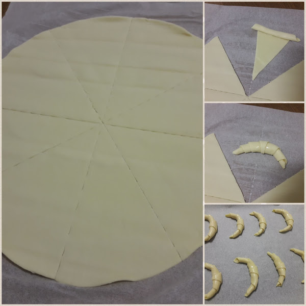 Con un cuchillo afilado o con un cortador de pizza cortamos la masa en triángulos.