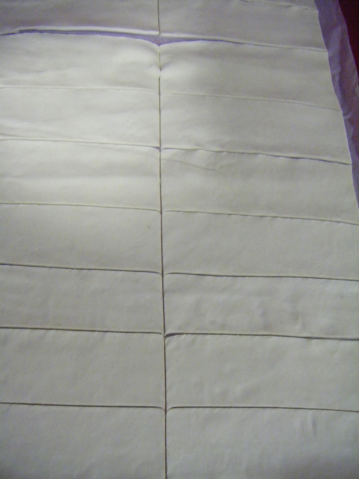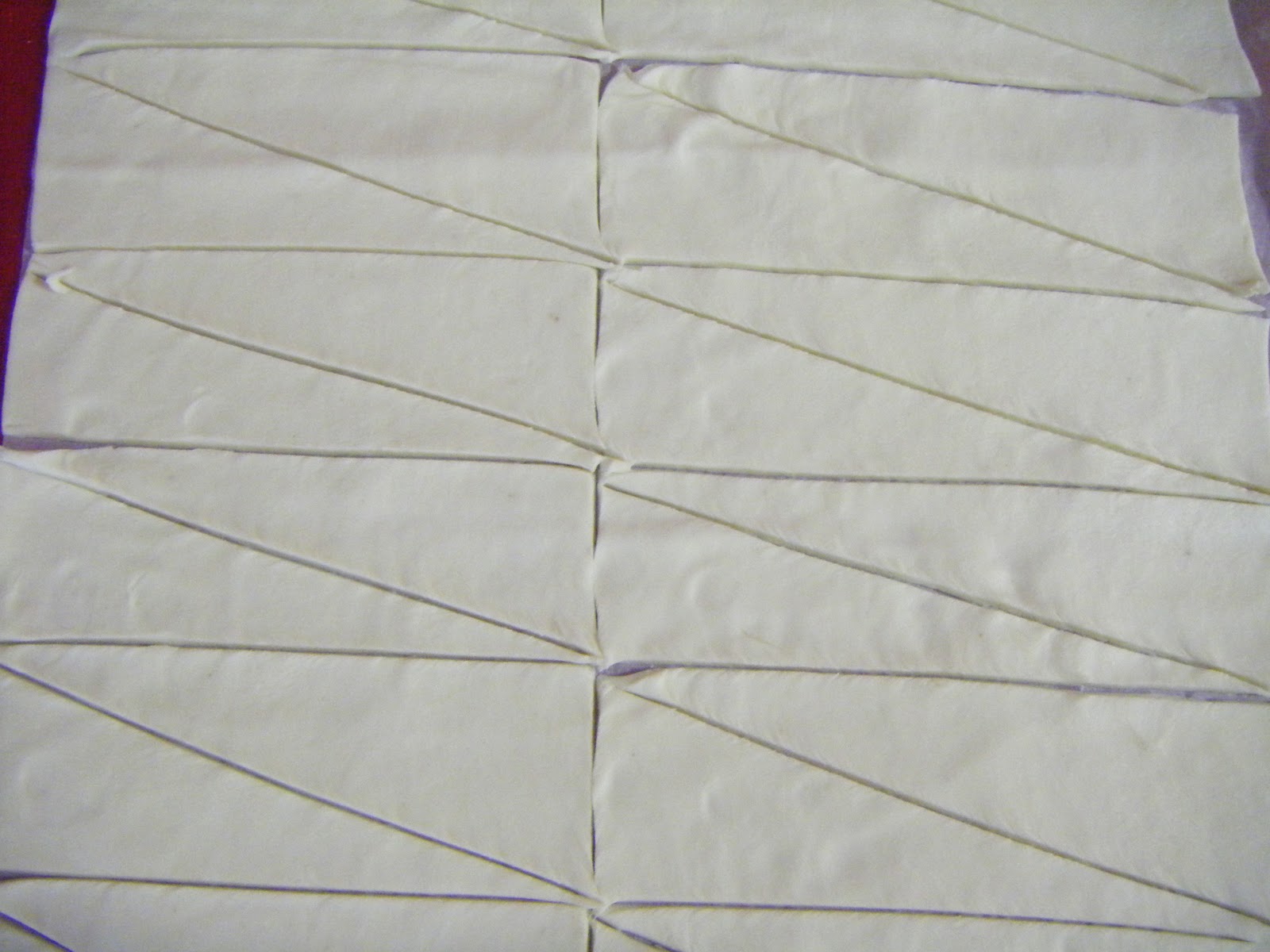 Extendemos la lamina de hojaldre y la cortamos en varias secciones por el lado horizontal y en dos secciones en el lado vertical.