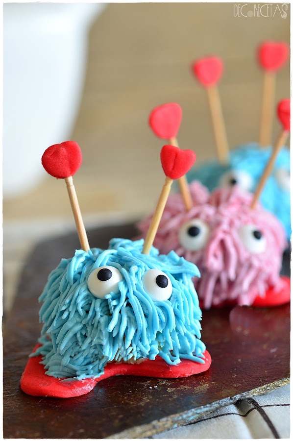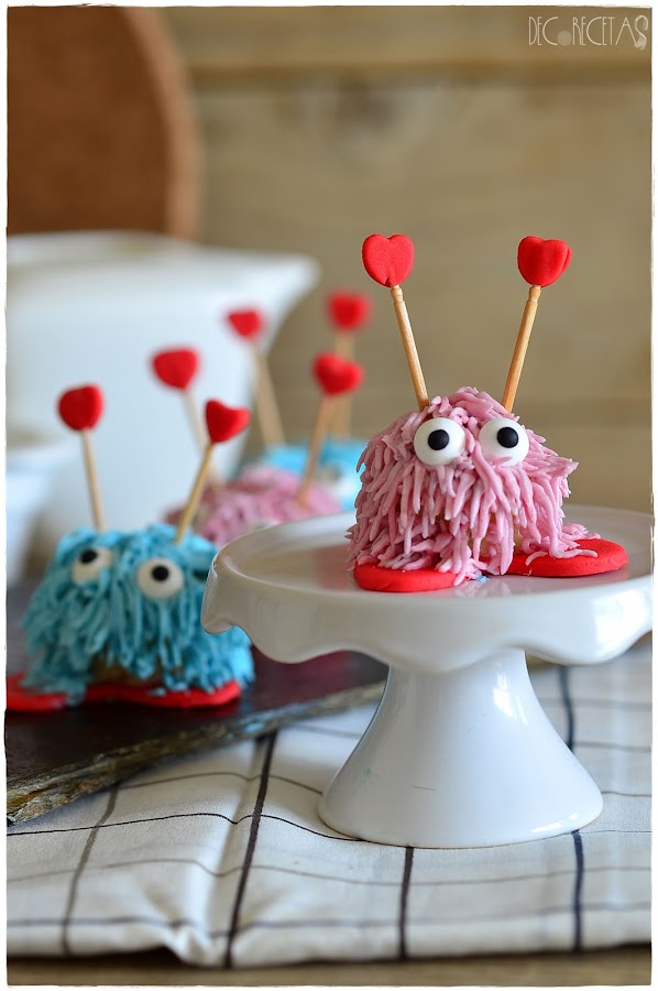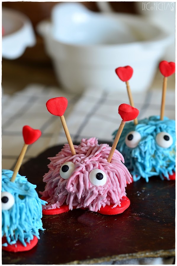Decoramos los mini cupcakes quitándoles el molde y depositándolos encima del corazón de fondant grande, para después ir poniendo la buttercream con la boquilla característica de césped dándoles el aspecto de los pelitos. Por último, colocamos las antenitas y los ojos de azúcar
