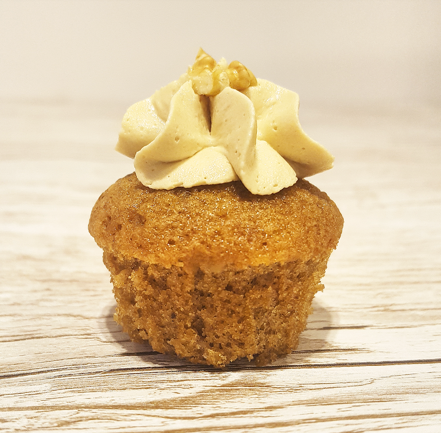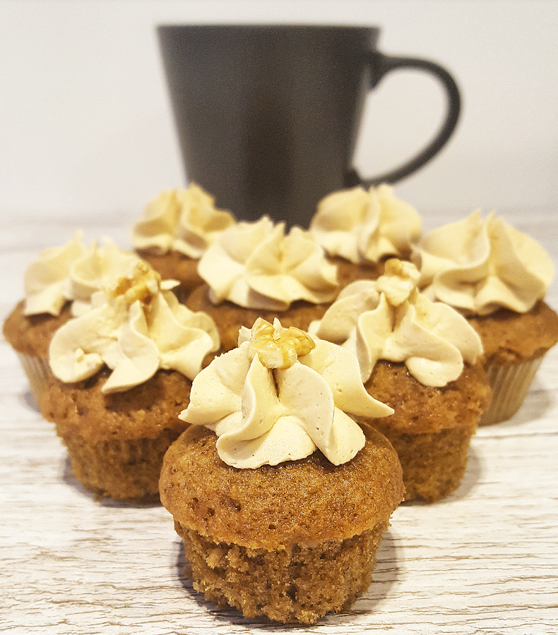 La receta es de uno de los libros de Alma Obregón. Pero ella la hace en forma de tarta y nosotros los vamos a presentar como mini cupcakes. Después de haberlos probado, la magdalena ha quedado con mucho sabor a nuez y la crema con mucho sabor a café. Así que creo que la próxima vez variaré un poco la receta para que queden los sabores más homogéneos.