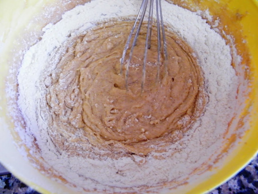 4. En otro recipiente mezclamos la harina y la levadura y los incorporamos a la mezcla húmeda. Removemos hasta mezclar por completo.