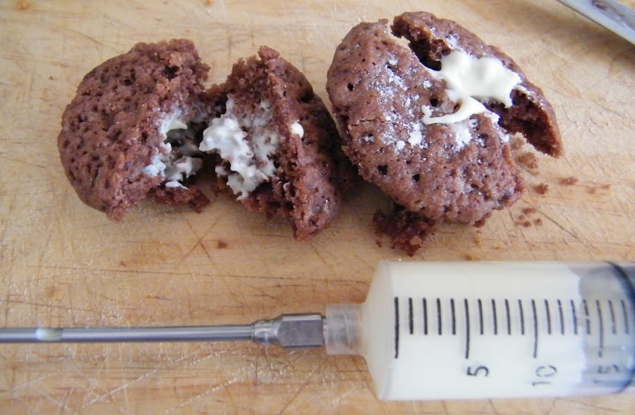 * Relleno de chocolate: Tenemos dos opciones sencillas. Si queremos que quede un trocito de chocolate en el fondo, simplemente pondremos un poquitín de masa en el molde, después el trozo de chocolate y finalmente el resto de la masa. Si lo que queremos es impregnar el interior con chocolate, necesitamos una jeringuilla para introducir salsas y rellenos líquidos. Cuando los cupcakes se hayan enfriado, derretiremos chocolate blanco, puro o con leche al baño maría (o en el microondas con cuidado), cargaremos la jeringuilla, pincharemos en el centro del cupcake y rellenaremos.