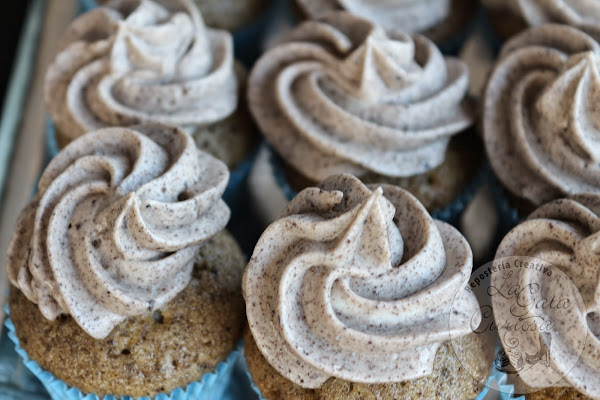 Para hacer la crema debemos tener la mantequilla a temperatura ambiente durante al menos un par de horas. Ponemos primero la mantequilla y la batimos durante un minuto, luego agregamos el icing sugar y dos cucharadas de postre de pasta de leche merengada, tapamos la maquina y batimos primero a velocidad lenta durante un par de minutos, luego a velocidad media alta durante otros 5. (En este punto podríamos darle color con un poco de colorante en pasta). Pasamos la crema a una manga pastelera con una bonita boquilla y decoramos nuestros cupcakes.