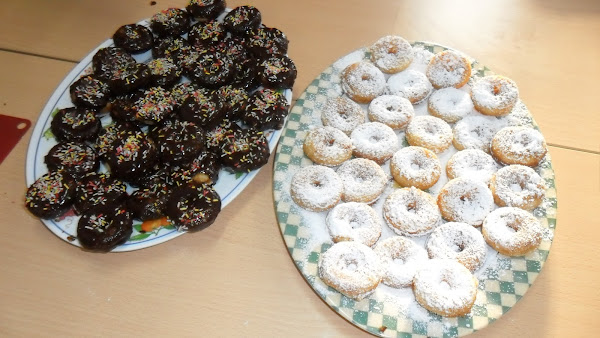 Una vez estén fríos vamos pasándolos por por el baño de chocolate, podemos pasarlos dos veces y quedan mas ricos.El resto los he espolvoreado con azúcar glass y si queremos podemos en caliente añadirles topins de colores, nueces sésamo tostado o lo que mas nos guste.Quedan de lo mas ricos y se hacen muy rápidos.