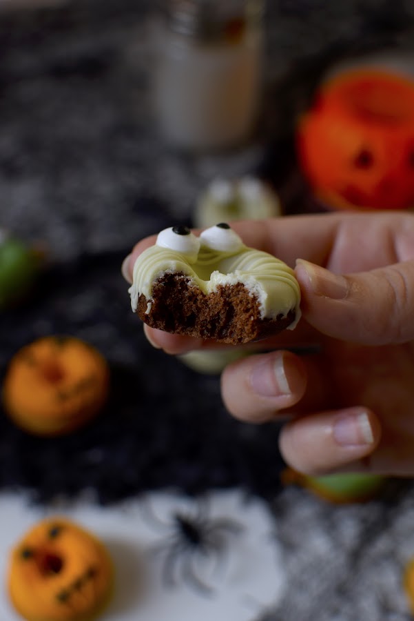 10. Para las momias, ponemos un poco de chocolate blanco en una manga pastelera y cortamos muy poquito el extremo (o usamos una boquilla), lo justo para que salga en forma de hilo y con un movimiento ligero, de un lado a otro, vamos haciendo líneas que simularán las vendas. Les ponemos encima los ojitos antes de que seque el chocolate. Para las calabazas hacemos lo mismo, pero trazamos líneas verticales simulando las hendiduras de las calabazas.