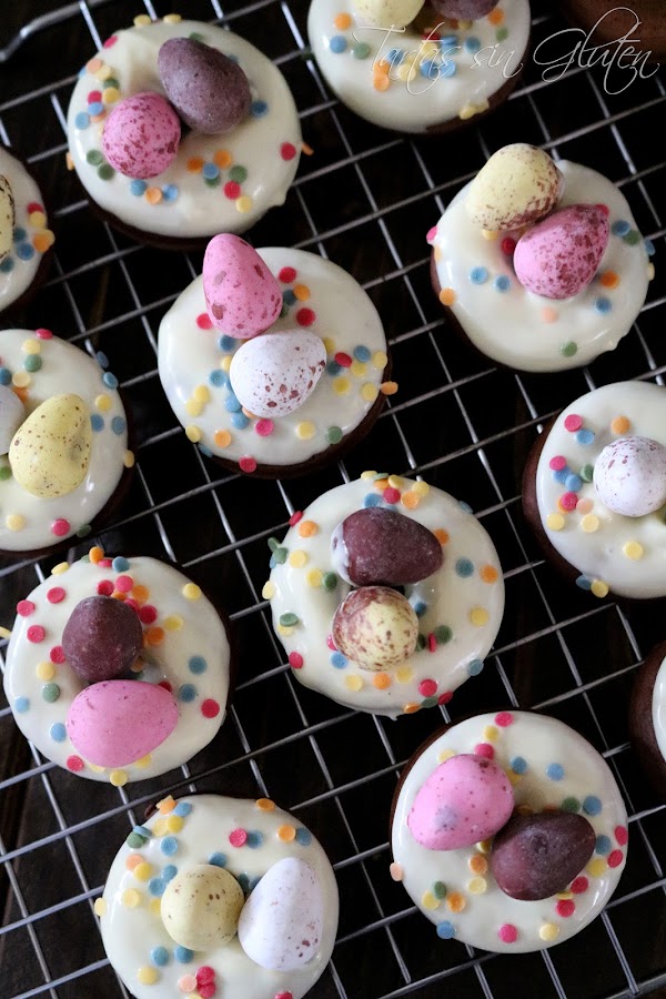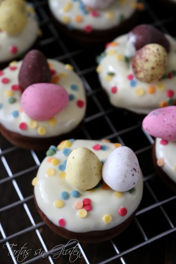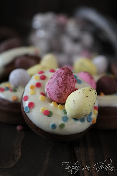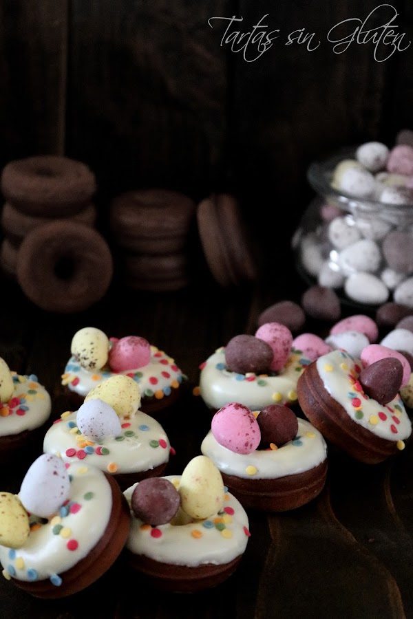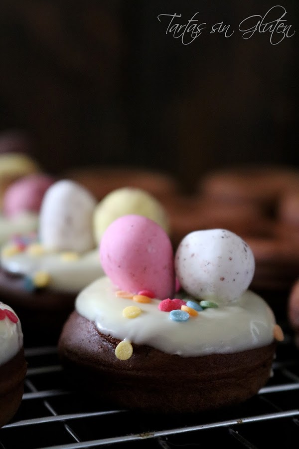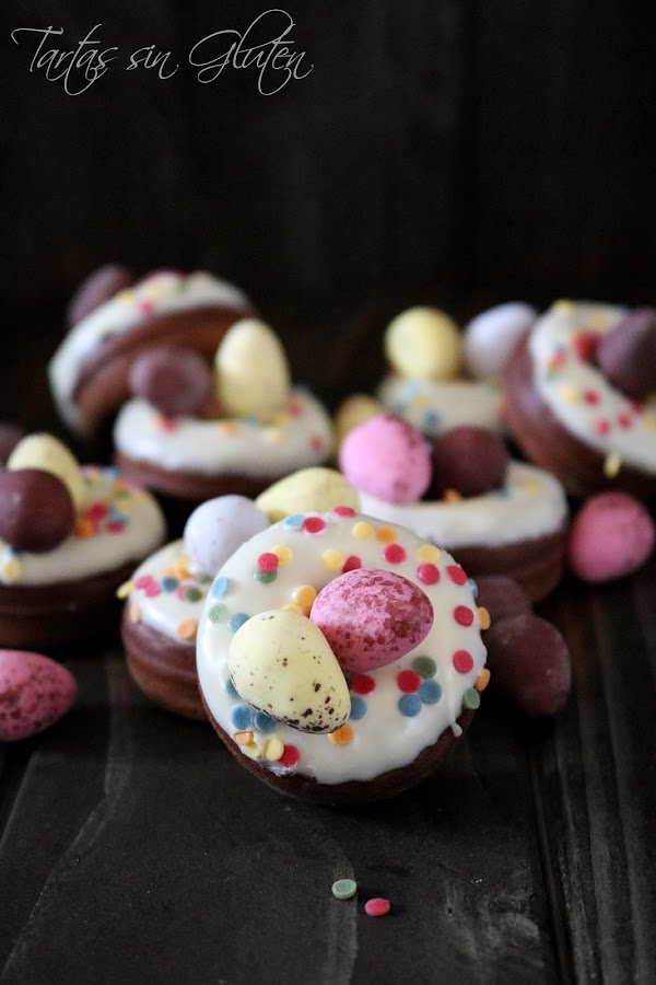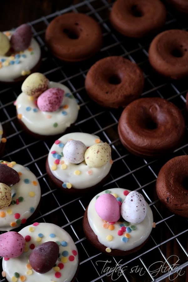 Para decorarlos, derretimos el chocolate blanco en el micro, bañamos los donuts y espolvoreamos con los sprinkles, colocamos uno o dos huevos de pascua ... y dejar endurecer el chocolate...y listo!!! Así de fácil y así de bonitos quedan.
