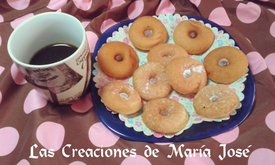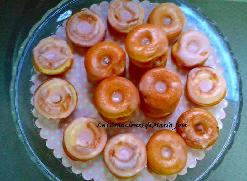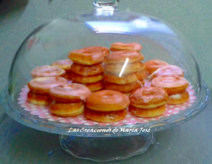 Echaremos todo en el bote, lo cerramos bien y lo meneamos, se hinchara un poco (no pasa nada) abrimos el bote, lo volvemos a cerrar y lo volvemos a menear. Ya estaría listo para echarlo en la donutera, hay que echarlo hasta cubrir el hueco. Cuando estén hechos y fríos se decoran al gusto, yo los moje en un poco de glasa; 100 gr de azúcar glas, 2 cucharitas de agua y unas gotas de colorante rojo, se mezcla todo, se remueve y se mojan los donuts. Listos para comer.