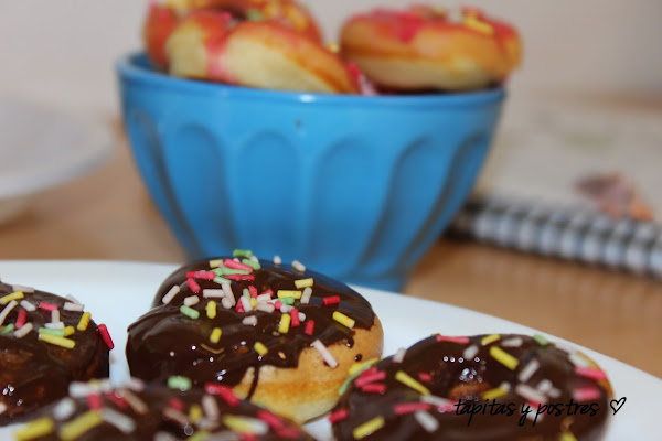 Bañamos los mini donuts en chocolate o en glasa y adornamos con fideítos de colores.
