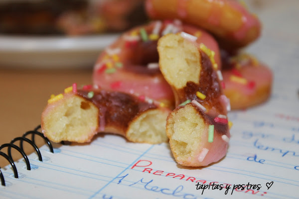 La receta es del blog de la cocina de Morilands, que también es maestro y ya había llevado esta receta a sus alumnos, por lo que me daba garantías de que saliera bien, porque sabor a donuts no tiene, es más bien como una rosquilla abizcochada, pero están muy buenas y la cobertura de chocolate y la glasa ayuda mucho.