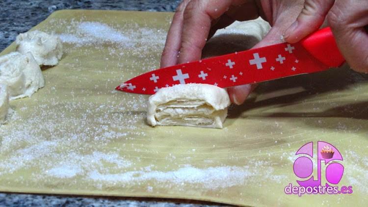 3.- Form the palmeritas: As we do we are left with one form or another. We can roll the puff pastry from both ends towards the center. We have a long cylinder of puff pastry. We cut it into slices of the desired thickness, which I like about half a centimeter.