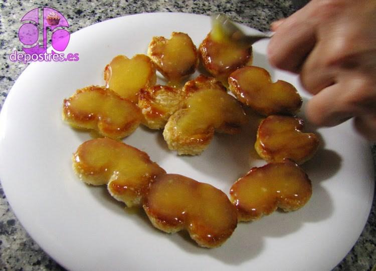 6.- The sugar glaze is made by mixing the icing sugar with the water until it is a paste. If we see that it is too thick we can add a few more drops of water or if we have too much liquid we can add some more sugar glas until it is to our liking. Wash the palms with this. Put in the refrigerator to make crust.