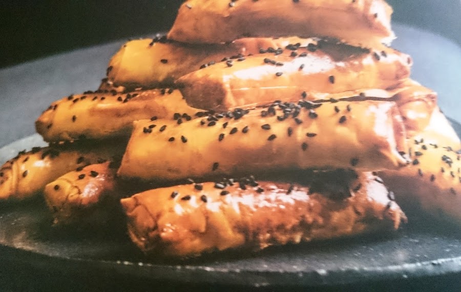 Colocamos las empanadillas sobre la bandeja del horno que hemos dejado ya preparada y repetimos el proceso con el resto de la pasta filo y del relleno. Pintamos por todos los lados las empanadillas con huevo batido y esparcimos por encima una pizca de semillas de sésamo para cocerlas durante unos 15 o 18 minutos o hasta que estén bien doradas. Servimos de inmediato.