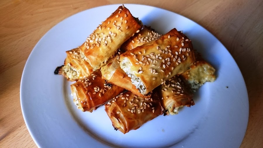 A continuación, disponemos una hoja de pasta filo sobre una superficie de trabajo limpia y la cortamos en cuatro cuadrados. Dejamos cerca el cuenco de los huevos batidos. Colocamos un cuadrado de masa delante nuestro, cogemos una cucharadita de la mezcla de queso feta, lo damos con las manos la forma de una salchicha y la colocamos en la parte de abajo de la pasta filo. Doblamos los bordes de la parte inferior para encerrar el relleno y enrollamos la pasta empezando por abajo, procurando mantener los bordes curvados. Mojamos los dedos en el huevo batido y sellamos todas las juntas para evitar que el relleno se salga durante la cocción.