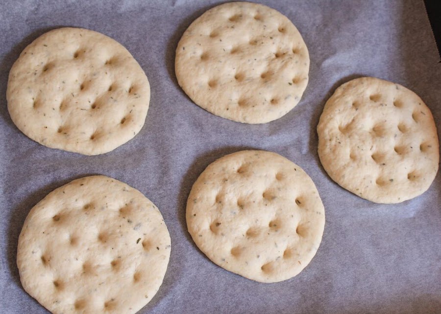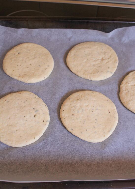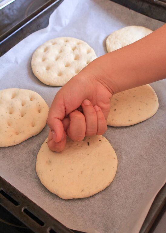 6. Aplanamos cada bolita en un circulo con la ayuda de un rodillo. Las ponemos encima de una bandeja de horno forrada con papel vegetal.
