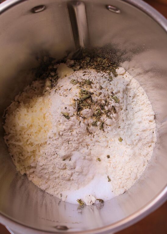 2. En otro bol, colocamos la harina junto con la sal, el ajo en polvo, el orégano, el tomillo, la albahaca , el queso rallado y la pimienta negra. Mezclamos.
