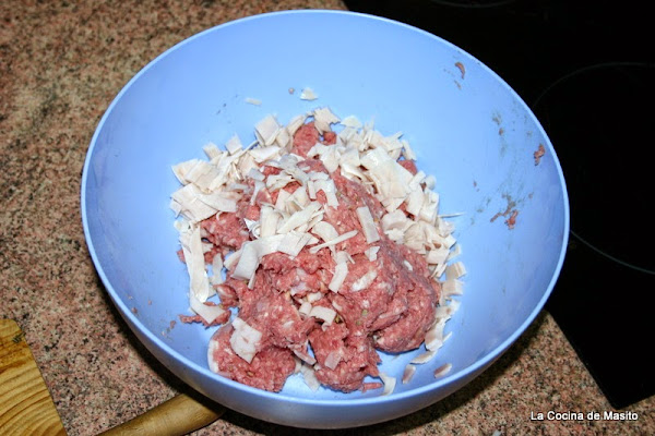 A continuación cortamos el bacon en tiras y lo echamos al bol de la carne