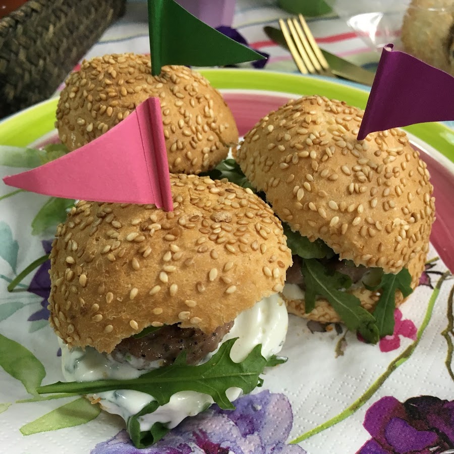 Se preparan las hamburguesas poniendo en la base del pan el tomate, encima la hamburguesa, la salsa de yogur y las hojas de rúcola. Se degusta inmediatamente.
