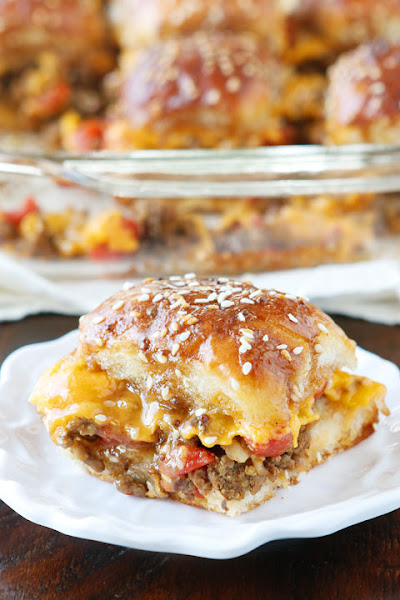 Colocamos en una fuente los panecillos, bien juntos para formar una capa con el pan. Sobre esta capa de pan ponemos una capa con la carne, que cubrimos con otra capa de lonchas de queso. Por ultimo terminamos con otra capa con la parte superior de los panecillos y reservamos esta fuente.
