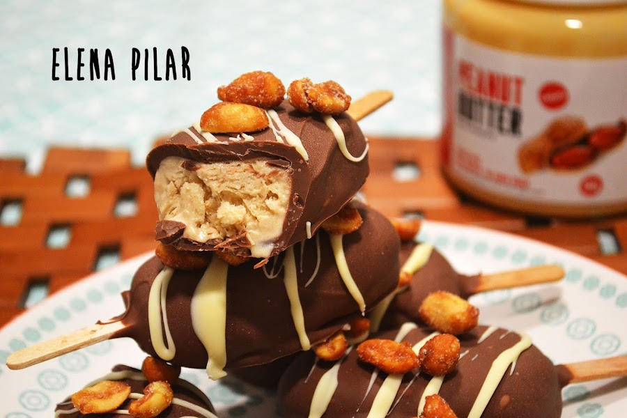 Desmoldamos los helados y los bañamos en el chocolate con leche. Hacemos un zigzag con el chocolate blanco fundido y aprovechando que aún está blandito, pegamos unos cuantos cacahuetes.