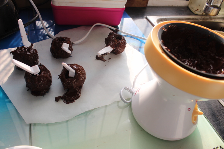 Hacía días que andaban dando vueltas unas manzanas pequeñísimas, para consumirlas se me ocurrió bañarlas en chocolate, utilizando una fondue que compre hace unos meses.