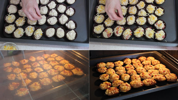 Rellenamos los moldes , les ponemos un poco de jamón y queso rallado encima y los horneamos con el horno precalentado a 175ºC durante 15- 20 minutos.