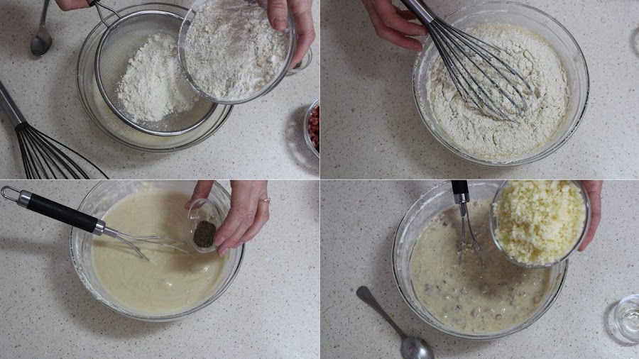 Le ponemos la pimienta molida. Vamos añadiendo la harina tamizada con la levadura poco a poco y por último añadimos el jamón picado y el queso rallado.