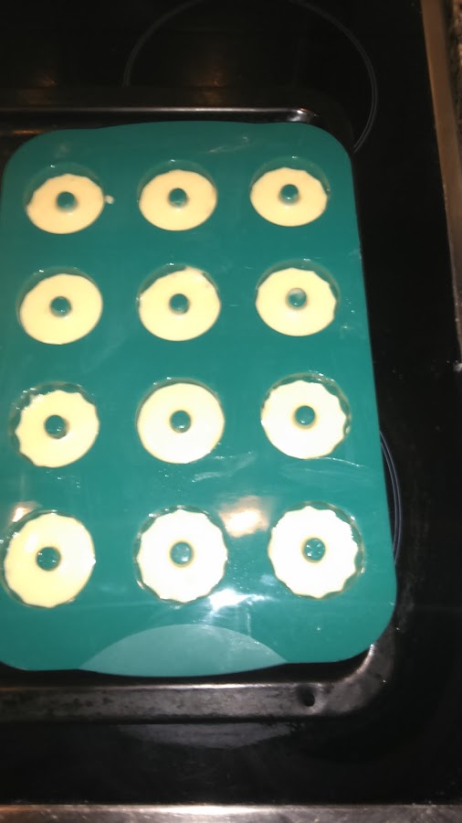 que habremos engrasado con unas gotitas de aceite se calienta el horno al máximo y cuando se pone la coca se baja a 150 durante media hora solo por la parte de baja del horno, se desmoldan y listos , pero como ya os dije anteriormente rellenos estan riquisimos