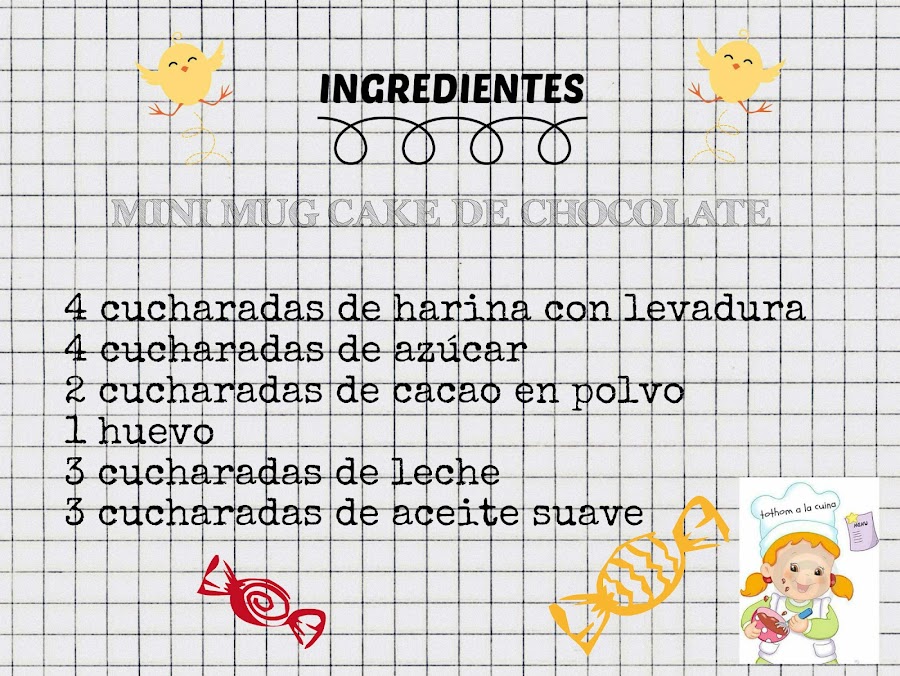 He aprovechado la ocasión para preparar los famosos "Mug cake" (bizcocho en taza). Muy fáciles de preparar. Se mezcla todos los ingredientes en la misma taza que vas a utilizar y unos minutitos al microondas.